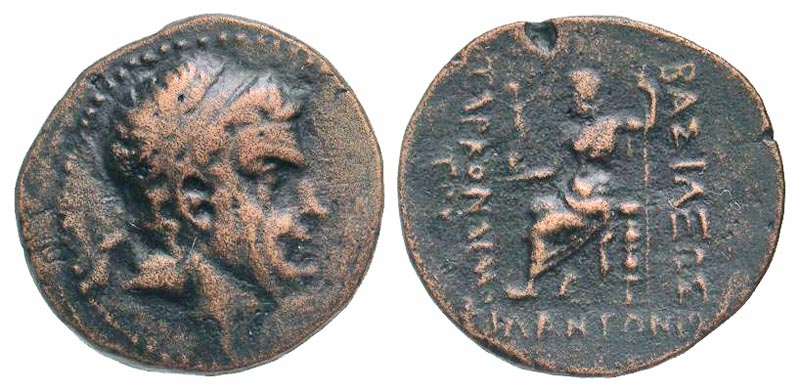 Kings of Cilicia. Tarkondimotos. 39-31 B.C. AE 22 (22.3 mm, 6.55 g, 1 h). Diademed head right / BAΣIΛEΩΣ / TAPKONΔIMO/TOY / ΦIΛANTΩNIOY, Zeus seated left holding Nike and scepter. RPC 3871; SNG France 1913-6; SNG Levante 1257-1258. aVF. Scarce.