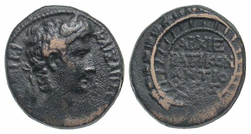 Syria, Seleucis and Pieria. Antiochia ad Orontem. Augustus. 27 B.C.-A.D. 14 AE semis (23.3 mm, 9.90 g, 12 h). Dated year 27 of the Actian Era (5/4 B.C.) AΡXIEΡEI KAIΣAΡ ΣEB, laureate head right / AΡXIE/ΡATIKON / ANTIO/XEIΣ / ZK, legend and date in five lines; all within crown. RPC 4251; McAlee 202. aVF.