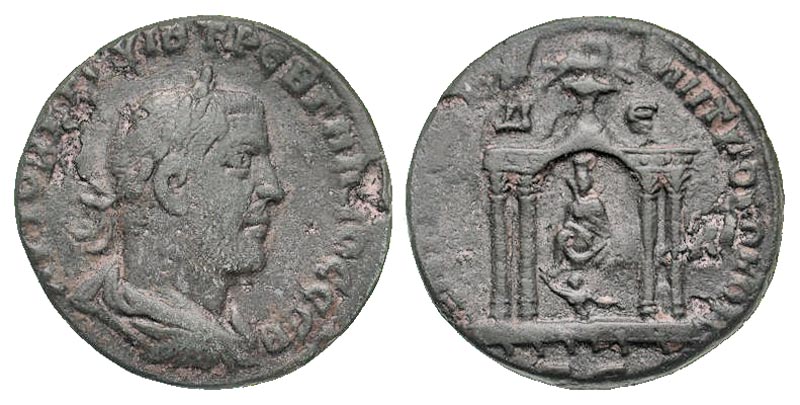 Syria, Seleucis and Pieria. Antiochia ad Orontem. Trebonianus Gallus. A.D. 251-253. AE octoassarion (28.8 mm, 14.40 g, 11 h). AVTOK K Γ OYIB TPEB ΓAΛΛOC CEB, laureate, draped, and cuirassed bust right / ANTIOXEΩN MHTPO KOΛΩN, Δ-Є, SC, Tyche seated facing within tetrastyle temple, A in right field; below, river god Orontes swimming left; above temple, ram jumping right, head left. cf. McAlee 1181; Butcher 507; SNG Cop 292; BMC 653. aVF. Rare Variety.