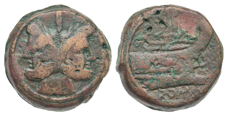 Anonymous. after 211 B.C. AE as (33.6 mm, 41.85 g, 11 h). Rome mint. Laureate head of bearded Janus; above, I / ROMA in exergue, prow of galley right; in right field, I. Crawford 56/2; Sydenham 143. Near VF, porous. A heavy example.
