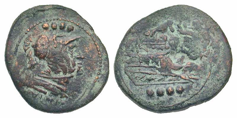Anonymous. after 211 B.C. AE triens (24.9 mm, 5.83 g). Sextanal standard. Sardinia mint. Helmeted head of Minerva; four pellets above / ROMA, prow of galley right; four pellets below. Crawford 56/4; Sydenham 302b. VF, overstruck.