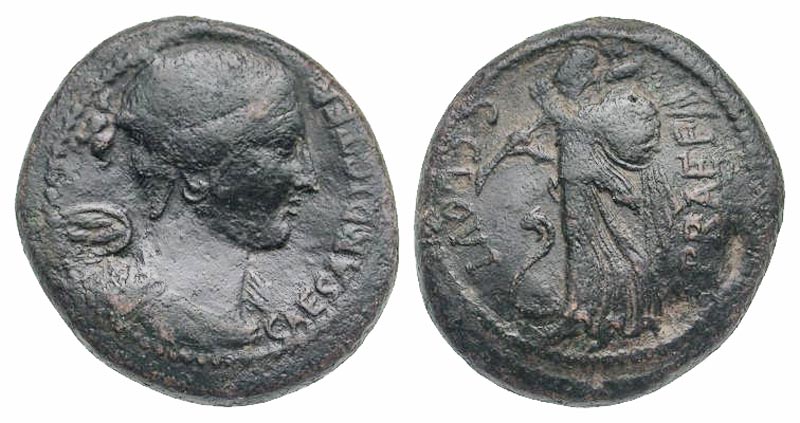 Julius Caesar. 45 B.C. AE dupondius (28.2 mm, 13.96 g, 11 h). Mediolanum(?) mint. C. Clovius, praefect. CAESAR·DIC·TER, draped bust of Victory right / C·CLOVI - PRAEF, Minerva standing left holding trophy over shoulder and shield decorated with Medusa, at her feet, snake left. Crawford 476/1a; Sydenham 1025; CRI 62; RPC 601. aVF, black patina. Scarce.
