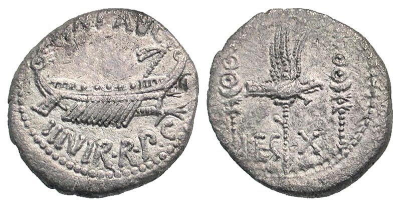 Mark Antony. AR denarius (17.5 mm, 3.12 g, 6 h). Patrae (?) , struck 32-31 B.C. ANT · AVG III VIR · R · P · C, praetorian galley right / LEG X, legionary eagle between two standards. Crawford 544/24; CRI 361; Sydenham 1228; RSC 38. near EF.