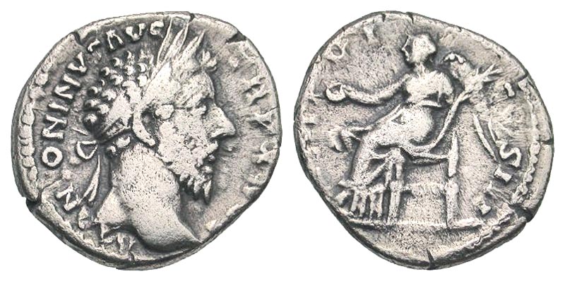 Lot 55-177. Marcus Aurelius. A.D. 161-180. AR denarius. Rome mint, struck A.D. 174-175.
