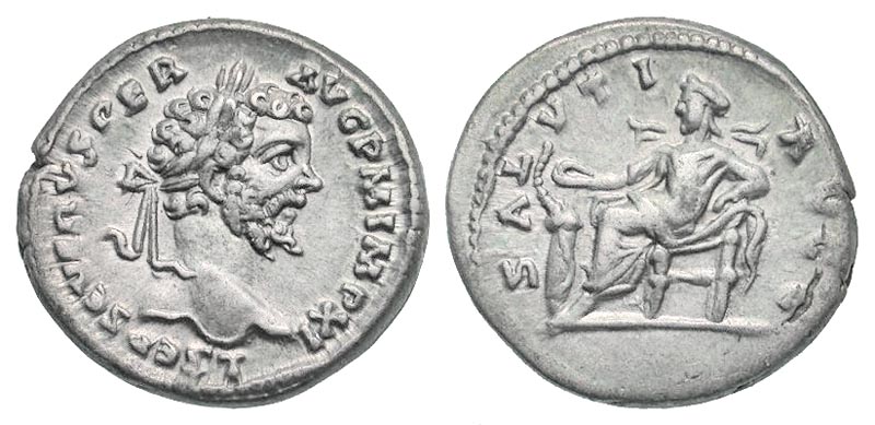 Septimius Severus. A.D. 193-211. AR denarius (19.4 mm, 4.12 g, 11 h). Laodicea ad Mare mint, struck A.D. 198. L SEP SEVERVS PER AVG P M IMP XI, laureate head right / SALVTI AVGG, Salus seated left on throne, feeding serpent rising from altar to left with patera. RIC 497; RSC 642. near EF.