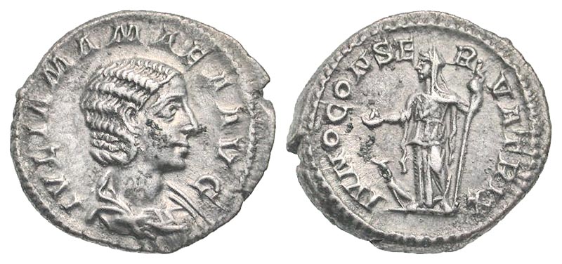 Julia Mamaea. Augusta, A.D. 222-235. AR denarius (20.5 mm, 3.51 g, 1 h). Rome mint, struck A.D. 222. IVLIA MAMAEA AVG, draped bust right / IVNO CONSERVATRIX, Juno standing left, holding patera and scepter, peacock at feet left. RIC 343 (S Alexander); BMCRE 43 (S Alexander); RSC 35. gVF.