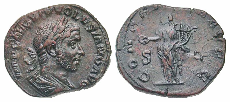 Volusian. A.D. 251-253. AE sestertius (30.6 mm, 17.36 g, 5 h). Rome mint, struck A.D. 253. IMP CAE C VIB VOLVSIANO AVG, laureate, draped and cuirassed bust right / CONCORDIA AVGG, S-C, Concordia standing left, holding double cornucopia and patera. RIC 249. near EF, glossy dark brown patina, slightly double struck on the reverse.