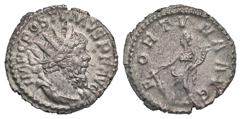 Postumus. Romano-Gallic Emperor, A.D. 260-269. AR antoninianus (21.5 mm, 3.77 g, 6 h). Treveri mint, struck A.D. 266. IMP C POSTVMVS P F AVG, radiate, draped, and cuirassed bust right / FORTVNA AVG, Fortuna standing left, holding rudder and cornucopia. RIC 60; AGK 23; RSC 80. Vf, grainy.