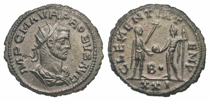 Probus. A.D. 276-282. AE antoninianus (22.4 mm, 3.83 g, 11 h). Antioch mint, struck A.D. 276. IMP C M AVR PROBVS AVG, radiate, draped, and cuirassed bust right, seen from behind / CLEMENTIA TEMP, emperor standing right, holding scepter surmounted by eagle, receiving globefrom Jupiter standing left, holding scepter; B· between / XXI. RIC 921. VF.