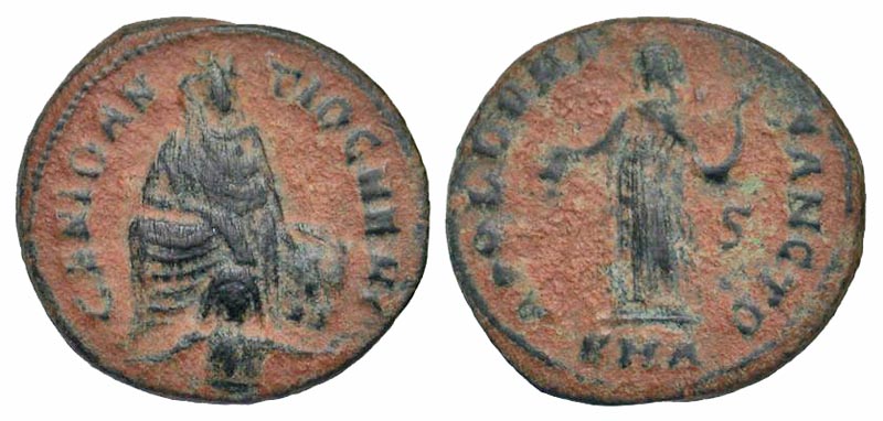 Anonymous Pagan Issues. Ca. A.D. 305-313. AE 1/12 nummus (16.0 mm, 1.70 g, 5 h). Antioch mint. GENIO ANTIOCHENI, Tyche of Antioch seated facing on rocks, holding ears of grain; river god Orontes swimming below / APOLLONI SANCTO, Apollo standing left, pouring wine from patera, and holding lyre; S in right field, SMA in exergue. McAlee 170f; Van Heesch 3a; Vagi 2954. aVF, red patina.