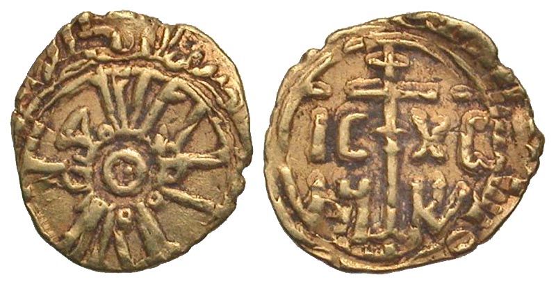 Italy, Norman Sicily. Roger II. 1105-1154. AV tari (12.5 mm, 0.79 g, 12 h). Palermo(?) mint, third series, struck 1140-1154. Arabic legend reading al-mu'tazz billah / al-malik rujjar, single pellet in center / aroound central pellet, IC/XC NI/KA in two lines across field flanking central cross pattee; mint and date in outer margin. Spahr 69; Biaggi 1220. EF.