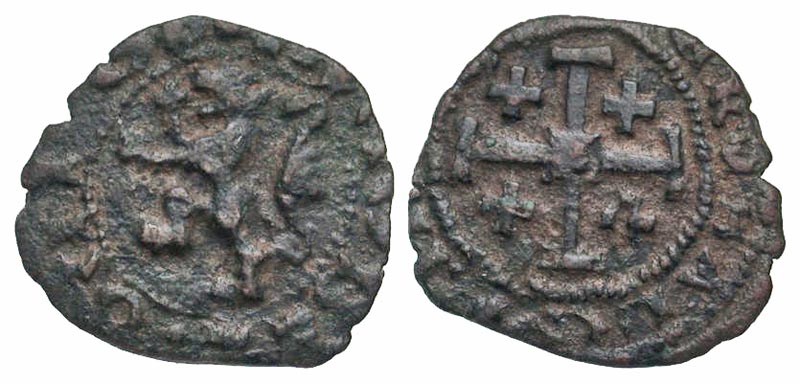 Crusader States, Lusignan Kingdom of Cyprus. James II. 1460-1473. AE sezin (18.0 mm, 1.24 g, 11 h). +IACVS DEI REX, rampant lion left / +IERUSALEM C, cross of Jerusalem, smaller crosses in quarters. Metcalf 14; CCS 164. aVF.