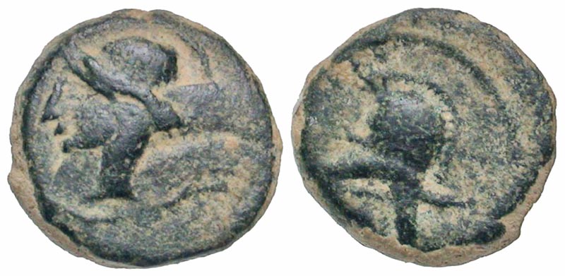 Iberia, Carthaginian Occupation. ca. 237-209 B.C. AE quarter unit (12.5 mm, 1.83 g, 11 h). Wreathed head of Tanit left / Helmet with ear guards left. ACIP 583; SNG BM Spain 67. VF, sandy patina.
