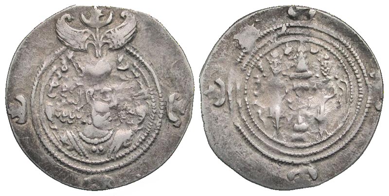 Lot 57-073. Sasanian Kingdom. Khusru II. A.D. 591-628. AR drachm. BYS (Bishapur) mint, dated RY 33.