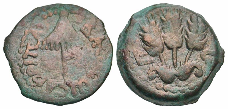 Lot 57-079. Judaea, Herodian Kingdom. Agrippa I. 37-44 C.E. AE prutah. Jerusalem mint, struck 41-42 C.E..