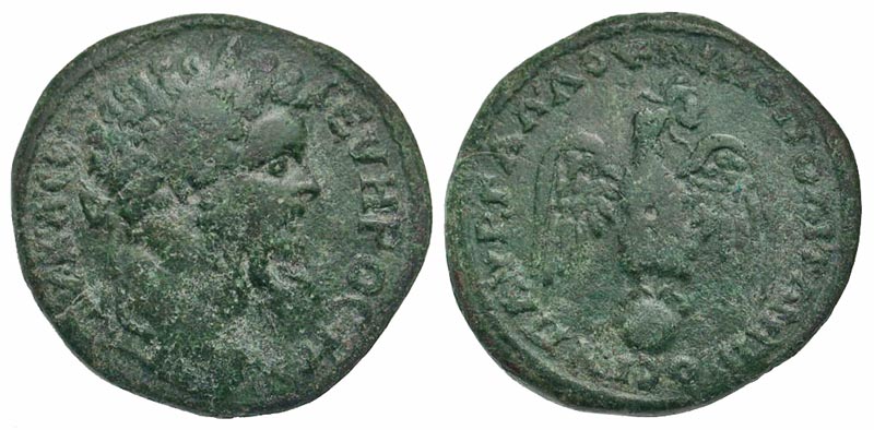 Moesia Inferior, Nicopolis ad Istrum. Septimius Severus. A.D. 193-211. AE tetraassarion (27.3 mm, 12.24 g, 6 h). struck A.D. 201-203. Aurelius Gallus, magistrate. AV K Λ CEΠ CEYHPOC Π, laureate head right / VΠ AVP ΓAΛΛOV NIKOPOΛITΩN ΠPOC I, eagle standing facing, head right, on globe, wreath in its beak. Varbanov 2693 var (obv. legend, no mention of globe); AMNG 1330; H &J 8.14.1.30 var (rev. legend). VF, green patina. Scarce.
