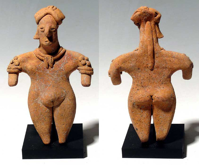 Colima Female Figure. A wonderful Colima figure from West Mexico, c. 300 BC – 300 AD. This standing female is 5-3/4” tall and is adorned with a fancy headdress, complex necklace, multiple bracelets and appliqué shoulder scarification. In excellent condition, with orange pigment, good root marks and mineral deposits. Ex Arnold estate. Value range $250 - $350.