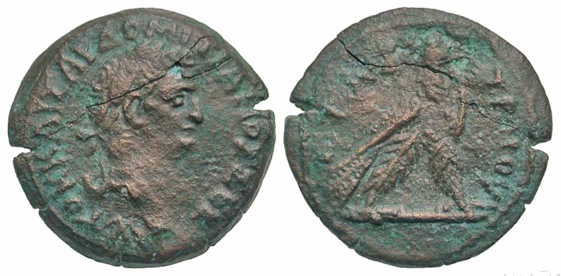 Egypt, Alexandria. Domitian. A.D. 81-96. AE diobol (24.6 mm, 7.50 g, 12 h). Dated RY 3 = A.D. 83-84. Scarce. AVTOK KAIΣAP ΔOMITIANOΣ ΣEB, laureate head right / ETOVΣ TPITOY, eagle standing right on thunderbolt, with closed wings. RPC 2492; Milne 474; Emmett 281. Fine, flan crack.