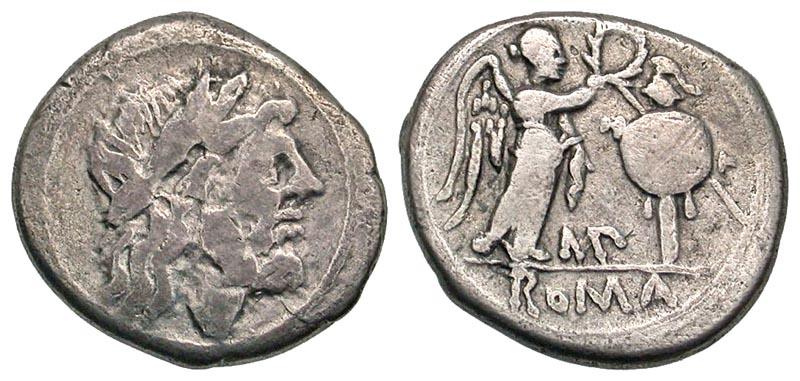Lot 57-118. Anonymous [MP]. Ca. 211-208 B.C. AR victoriatus. Uncertain mint. Rare. Ex RBW collection (not in previous sales); Ex Kurt Loret collection.