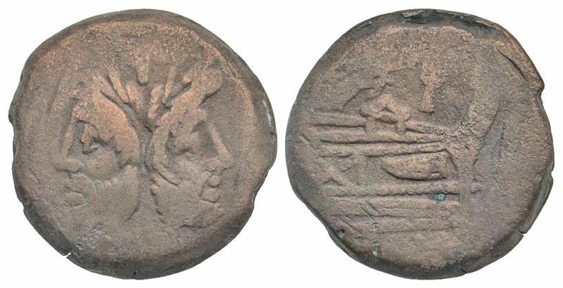Anonymous. 189-180 B.C. AE as (33 mm, 33.41 g, 2 h). Rome mint. Laureate head of bearded Janus; above, I / [ROMA] in exergue, prow of galley right; above, Victory flying right and spearhead; in right field, I. Crawford 145/1; Sydenham 293. near Fine.