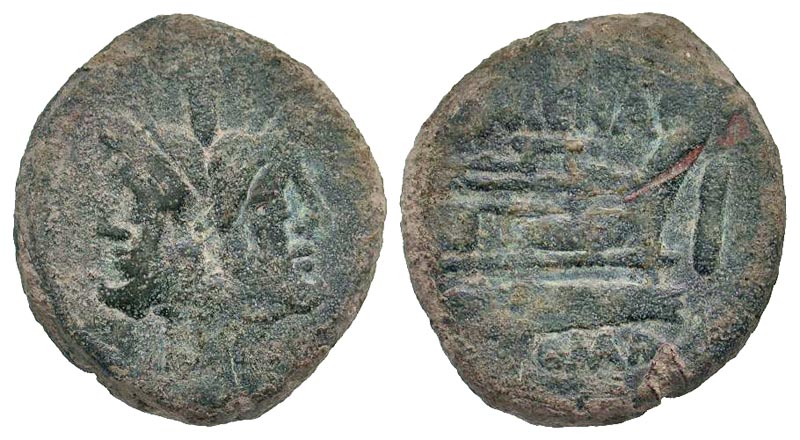 L. Licinius Murena. Ca. 169-158 B.C. AE as (35.0 mm, 25.23 g, 11 h). Rome mint. Laurete head of bearded Janus, I above / MVRENA / ROMA, prow of galley right, I to right. Crawford 186/1; Sydenham 373. Fine.