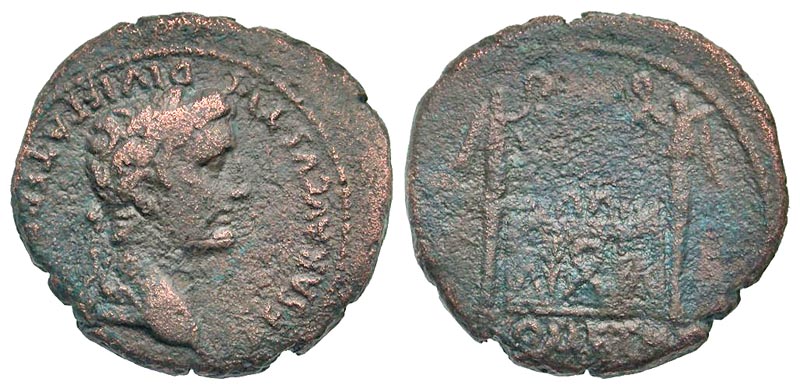 Augustus. 27 B.C.-A.D. 14 AE semis (26.9 mm, 10.61 g, 11 h). Lugdunum mint, struck 9-14 B.C. CAESAR AVGVSTVS DIVI F PATER PATRIAE, laureate head right / ROM ET AVG in exergue, front elevation of the Altar of Lugdunum, decorated with the corona civica between laurels, these being flanked by nude male figures; to left and right, Victories on columns, facing one another. RIC 234; BMCRE 568. Fine, porous.