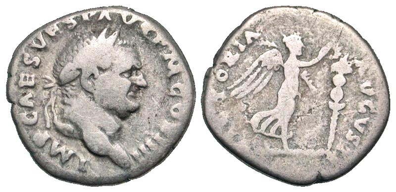 Vespasian. A.D. 69-79. AR denarius (18.9 mm, 2.99 g, 7 h). Rome mint, struck A.D. 72-73. Part of the Judaea Capta series. Scarce. IMP CAES VESP AVG P M COS IIII, laureate head right / VICTORIA AVGVSTI, Victory advancing right, holding palm and placing wreath on a standard. RIC 362; BMCRE pg. 13 note; RSC 617a. Fine.