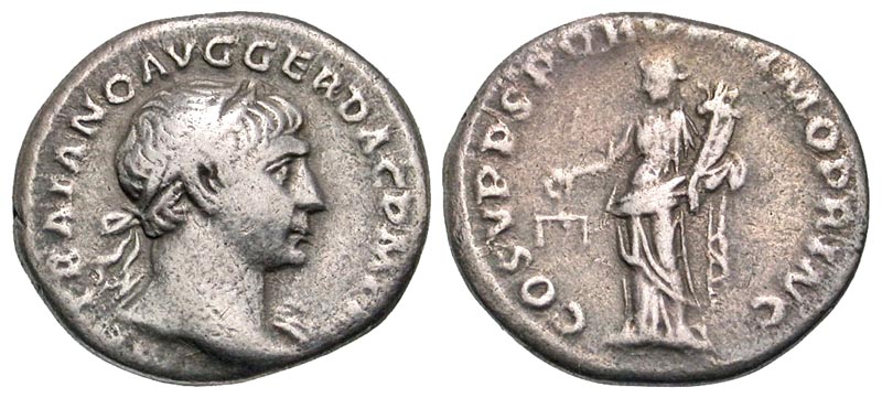 Lot 57-165. Trajan. A.D. 98-117. AR denarius. Rome mint, struck A.D. 107-111.