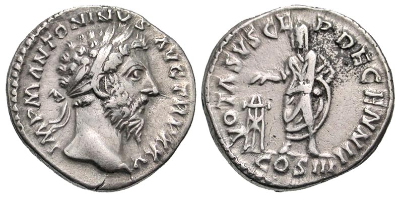 Lot 57-170. Marcus Aurelius. A.D. 161-180. AR denarius. Rome mint, struck A.D. 171.