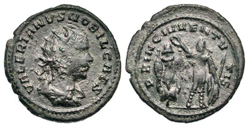 Valerian II. Caesar, A.D. 253-255. BI antoninianus (22.3 mm, 3.12 g, 6 h). Samosata mint, Struck A.D. 255-256. VALERIANVS NOBIL CAES, radiate and draped bust right / PRINC IVVENTVTIS, Valerian standing facing, head left, crowning trophy to left and holding spear and shield. RIC 49; Göbl 1694b; RSC 67a. aVF.