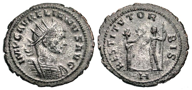 Aurelian. A.D. 270-275. AE antoninianus (24.2 mm, 4.21 g, 6 h). Antioch mint, struck A.D. 272-273. IMP C AVRELIANVS AVG, radiate and cuirassed bust right / RESTITVT ORBIS, Female standing right, presenting wreath to Aurelian standing left, holding scepter; H in exergue. RIC 386. Choice EF, fully silvered on a broad flan.
