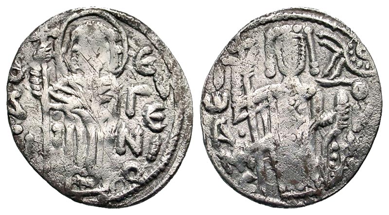 John II. 1280-1297. AR asper (23.7 mm, 2.56 g, 7 h). Constantinople mint. OAΓI EVΓENI Q, St. Eugenius standing, holding long cross / IWANIC OK H, John standing, holding labarum and akakia, Manus Dei above, star below. BMC 46; SBV 2608. Fine.