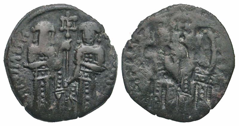 Andronicus II and Michael IX. 1295-1320. AE assaria (20.7 mm, 1.99 g, 12 h). Constantinople mint. ANΔPONIKOC MIXAHΛ, Andronicus and Michael standing facing, holding labarum between them / Incuse of the obverse. SBV 2436; DOC 6818-2. aVF. Scarce.