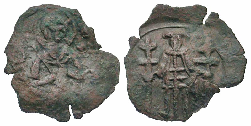 Andronicus III Palaeologus. 1328-1341. AE trachy (20.3 mm, 1.16 g, 5 h). Thessalonica mint. Facing bust of St. Demetrius / Andronicus standing holding patriarchal cross in each hand. SBV 2486; DOC 927. F/VF, irregluar flan.