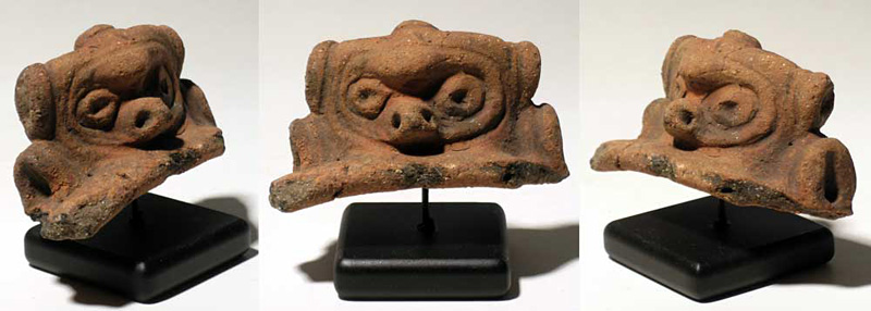 Taino Head of the Monkey God. A superb Taino head fragment from Hispaniola, c. 1000 – 1500 AD. It is 3-1/2” wide and depicts a zoomorphic deity, most likely the Monkey God. Superbly detailed, good mineral deposits, mounted on stand. Ex Alex Acevedo, 1970’s. Value range: $100 - $150.