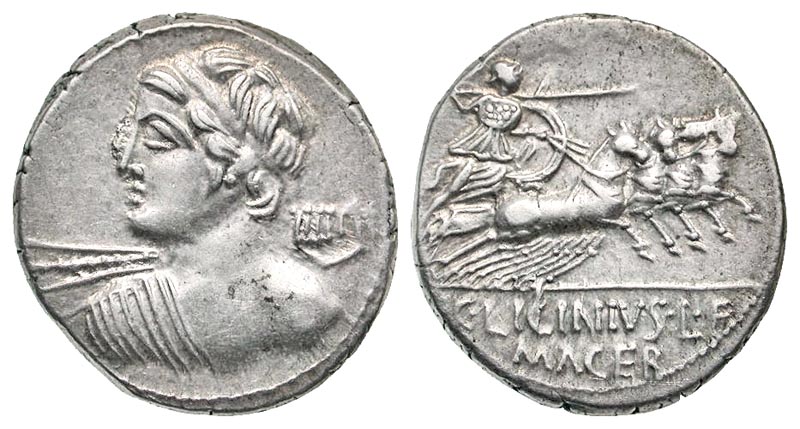 Lot 58-147. C. Licinius L.f. Macer. 84 B.C. AR denarius. Rome mint.
