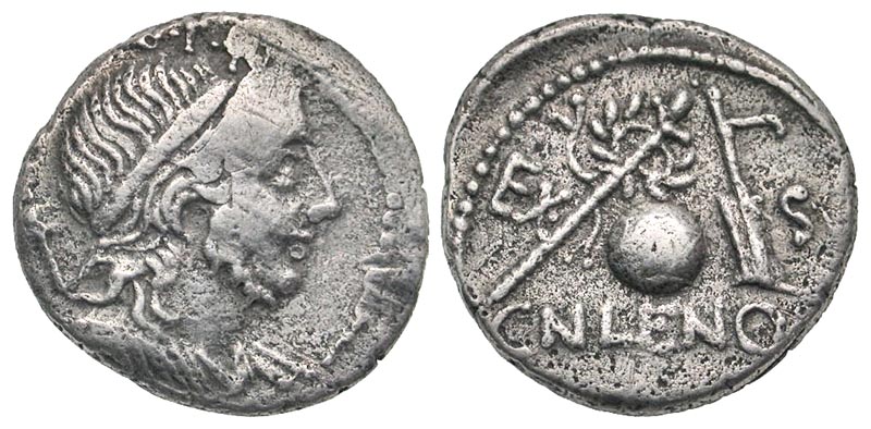 Cn. Cornelius P.f. Lentulus Marcellinus. 76-75 B.C. AR denarius (18.4 mm, 3.51 g, 5 h). Uncertain Spanish mint. Diademed and draped bust of Genius Populi Romani right; scepter over shoulder / EX-SC / CN · LEN · Q, wreathed scepter, globe, and rudder. Crawford 393/1a; Sydenham 752; RSC Cornelia 54. aVF, a bit porous.