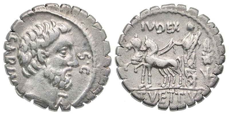 T. Vettius Sabinus. 66 B.C. AR serrate denarius (19.2 mm, 3.89 g, 5 h). Rome mint. SABINVS S·C, AT monogram below chin, bare head of Tatius right / IVDEX / T·VETTIVS, togate figure, driving biga left, holding reins and scepter; grain ear behind. Crawford 404/1; Sydenham 905; RSC Vettia 2. VF.