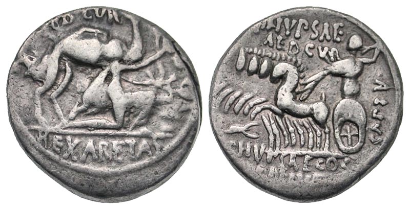 This coin series is the first instance of a moneyer commemorating an event from his own career. As governor of Syria, Scaurus repressed the Nabataeans and compelled their king, Aretas, to pay a fine and submit to Pompey.