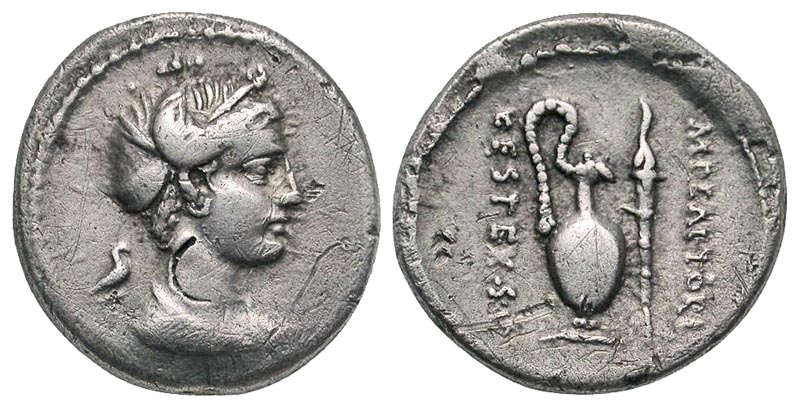 Lot 58-152. M. Plaetorius M.f. Cestianus. 57 B.C. AR denarius. Rome mint.