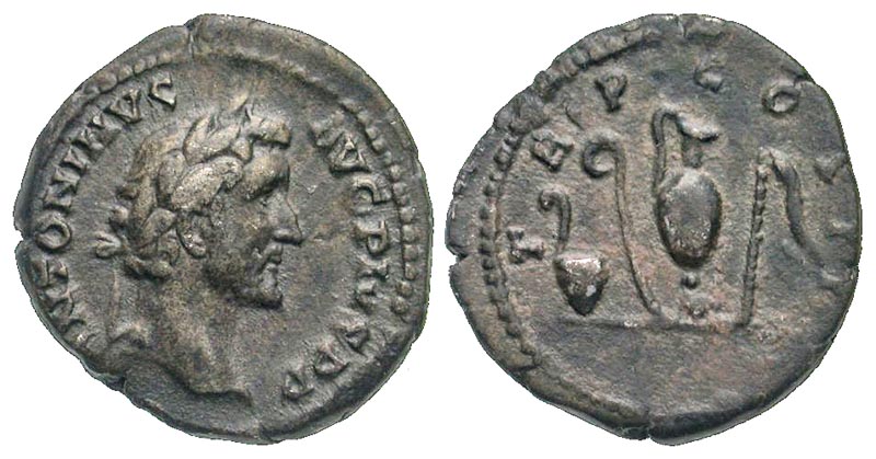 Antoninus Pius. A.D. 138-161. AR denarius (18.4 mm, 3.21 g, 7 h). Rome mint, struck A.D. 139. ANTONINVS AVG PIVS P P, laureate head right / TR P COS II, priestly implements: simpulum, lituus, ewer, and sprinkler. RIC 45 var (bare head, reverse arrangement plus knife); BMC 91* var (same); RSC 835e var (bare head). Near VF, dark brown toning.