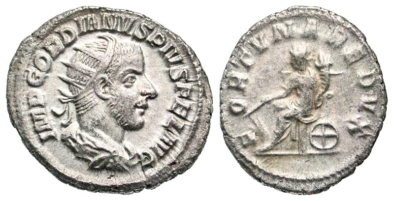 Gordian III. A.D. 238-244. AR antoninianus (23.6 mm, 4.35 g, 2 h). Rome mint, struck A.D. 244. IMP GORDIANVS PIVS FEL AVG, radiate, draped, and cuirassed bust right / FORTVNA REDVX, Fortuna seated left, holding rudder and cornucopia, wheel below. RIC 144; RSC 98. VF/F.