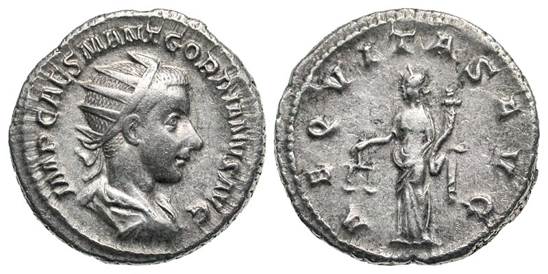Gordian III. A.D. 238-244. AR antoninianus (21.5 mm, 4.60 g, 8 h). Antioch mint, struck A.D. 238-239. IMP CAES M ANT GORDIANVS AVG, radiate, draped, and cuirassed bust right / AEQVITAS AVG, Aequitas standing left, holding scales and cornucopia. RIC 177; RSC 17. VF.