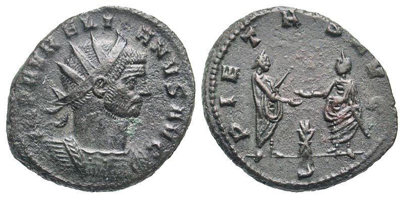 RIC notes "The figure which accompanies the emperor is variously described as a priest, a soldier, or the Empress." The figure here is clearly togate and female, it could only be Severina.
