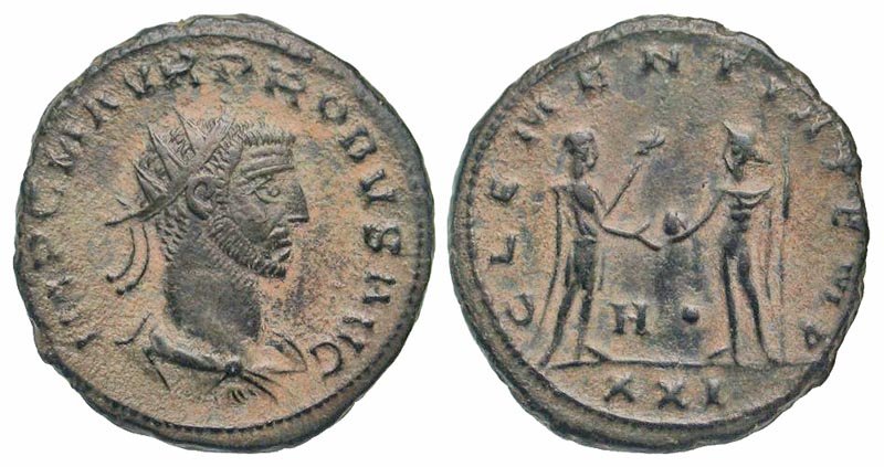 Probus. A.D. 276-282. AE antoninianus (22.1 mm, 4.51 g, 11 h). Antioch mint, struck A.D. 276. IMP C M AVR PROBVS AVG, radiate, draped, and cuirassed bust right, seen from behind / CLEMENTIA TEMP, emperor standing right, holding scepter surmounted by eagle, receiving globefrom Jupiter standing left, holding scepter; H· between / XXI. RIC 921. VF.