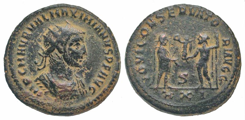 Maximianus. First reign, A.D. 286-305. AE follis (21.1 mm, 4.27 g, 11 h). Siscia mint, struck A.D. 285. IMP C M AVR VAL MAXIMIANVS P F AVG, radiate and cuirassed bust right / IOVI CONSERVATORI AVGG, emperor standing right, holding scepter and receiving Victory on globe from Jupiter standing left, holding a scepter; S between, XXI in exergue. RIC 623. EF, black patina with earthen highlights.