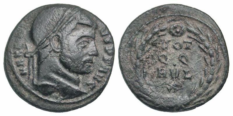 Maxentius. A.D. 306-312. AE quarter follis (17.1 mm, 1.87 g, 7 h). Rome mint, struck A.D. 310-312. MAXENTIVS P F AVG, laureate head right / VOT/ Q·Q/ MVL/ X, legend in four lines within laurel wreath. RIC 281a. aVF. Scarce.