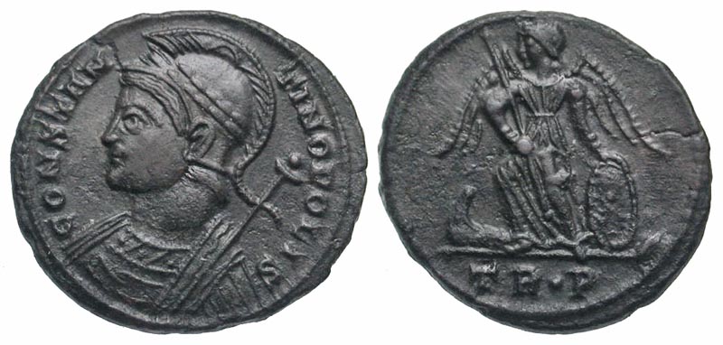 City Commemorative. A.D. 330-354. AE follis (18.4 mm, 2.13 g, 11 h). Treveri mint, struck A.D. 332/3. CONSTAN-TINOPOLIS, laureate and helmeted bust of Constantinopolis left, wearing imperial mantle, scepter over shoulder / Victory standing left, right foot on prow, holding scepter and shield; TR·P. RIC 543; LRBC 66. VF, brown patina.