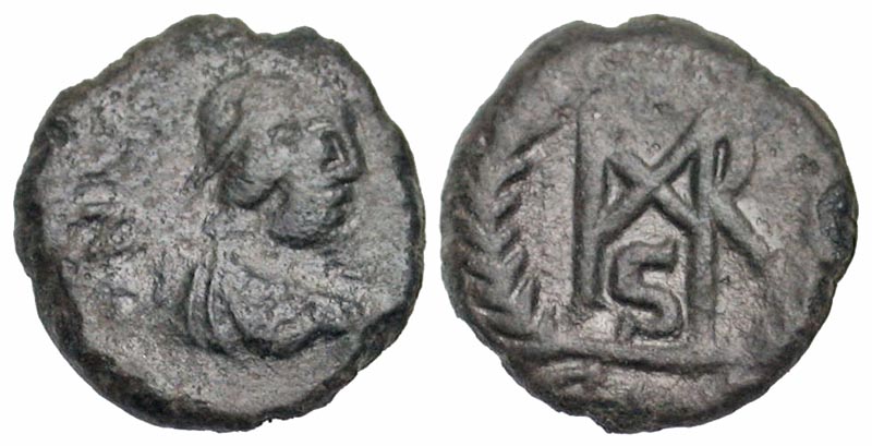 Marcian. A.D. 450-457. AE 4 (11.5 mm, 1.06 g, 11 h). Constantinople mint. D N MARCIANVS P F AVG, pearl-diademed, draped, and cuirassed bust right / Monogram within wreath; CON in exergue. RIC 546; LRBC -. VF, clear monogram.