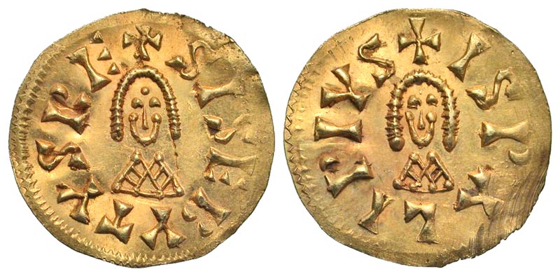 Visigoths. Sisebut. 612-621. AV tremis (19.4 mm, 1.46 g, 7 h). Ispalis (Seville) mint. + SISEBVTVS RE, bust facing / + ISPALI PIVS, bust facing. CNV 219; Miles 187a; MEC 1. EF, sharply struck, a superb example of the type.